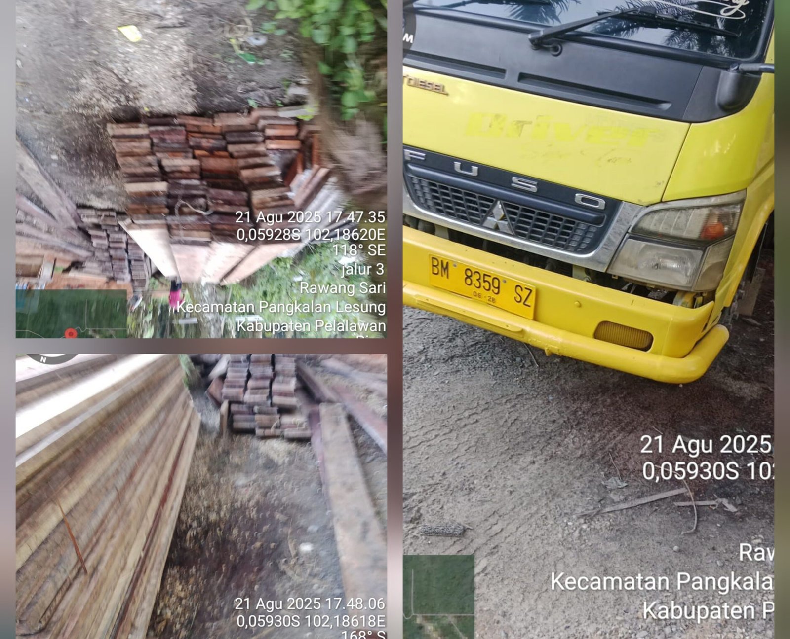 Dugaan praktik ilegal logging kembali mencuat di Kabupaten Pelalawan, Provinsi Riau. Dua foto yang beredar memperlihatkan sebuah truk Fuso berwarna kuning dengan nomor polisi BM 8359 SZ sedang berada di lokasi tumpukan kayu olahan. Lokasi kejadian tercatat di Rawang Sari, Kecamatan Pangkalan Lesung, Kabupaten Pelalawan, sesuai data koordinat dalam gambar.